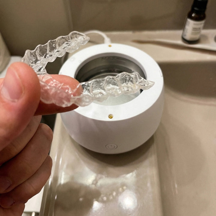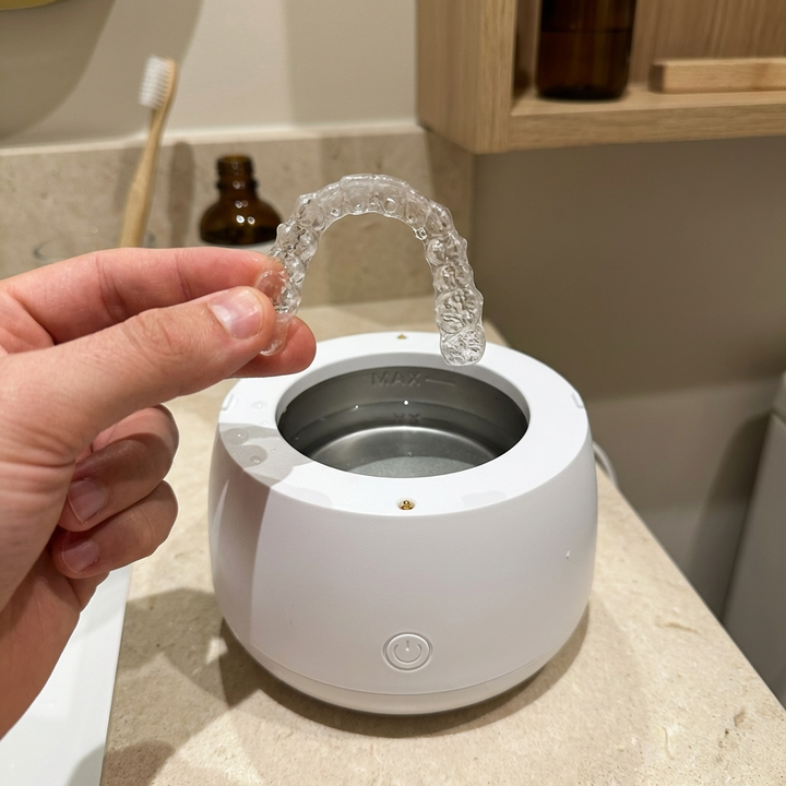 Notre système est non-abrasif. Il est certifié pour les aligneurs transparents (Invisalign, Spark), les appareils de contention, les prothèses dentaires (dentiers) et les protège-dents. Il préserve la brillance et la transparence d'origine.